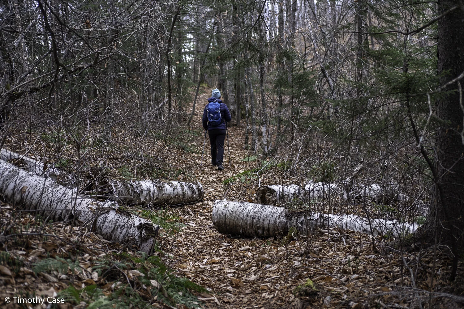 Barbara walks past a fallen Grey Birch tree. 11.21.20.