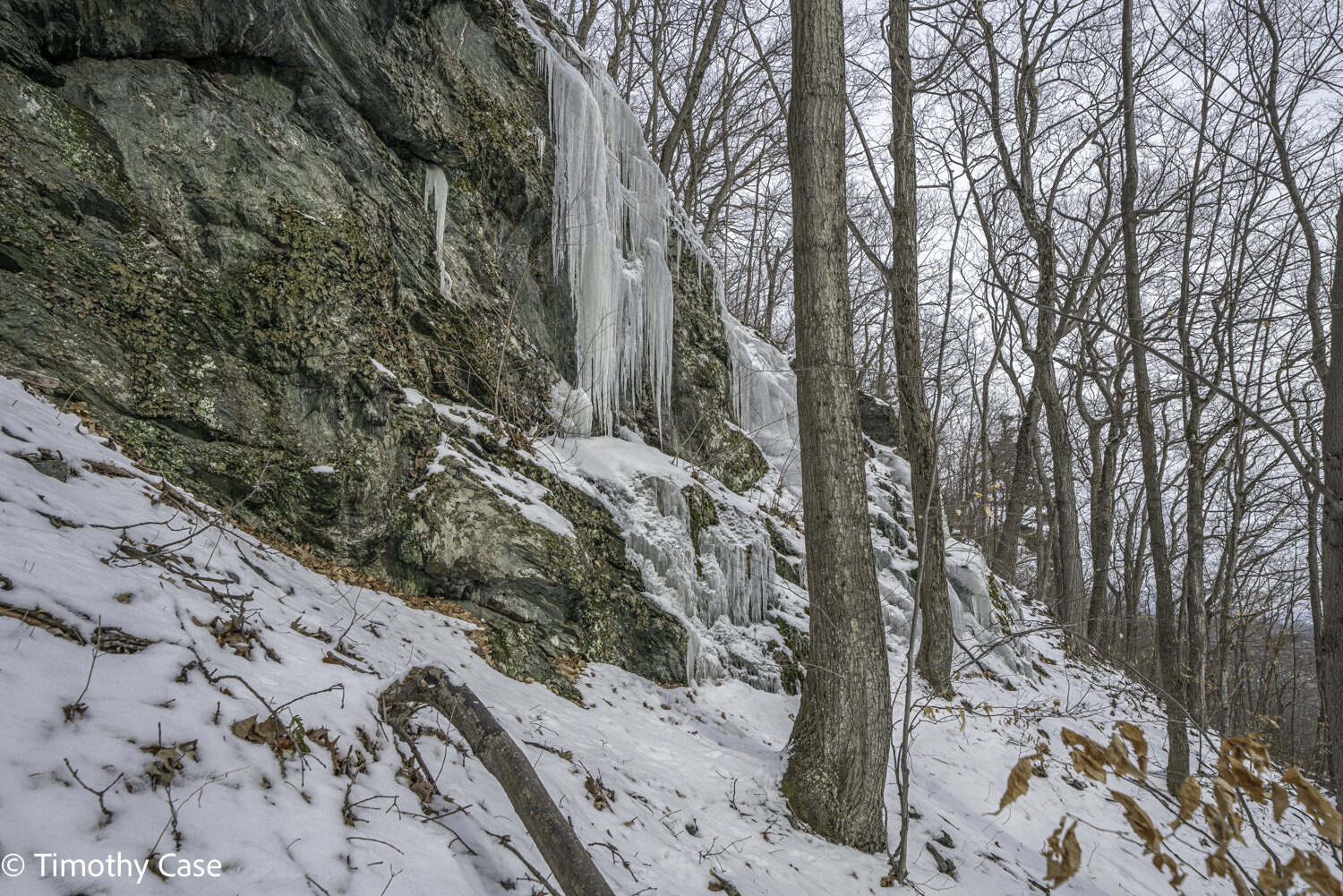 Icicles. The mountain is steep here and going off trail to reach the vantage point here, I found the footing very slippery because of the deep piles of leaves hidden under the snow. 01-15-2021