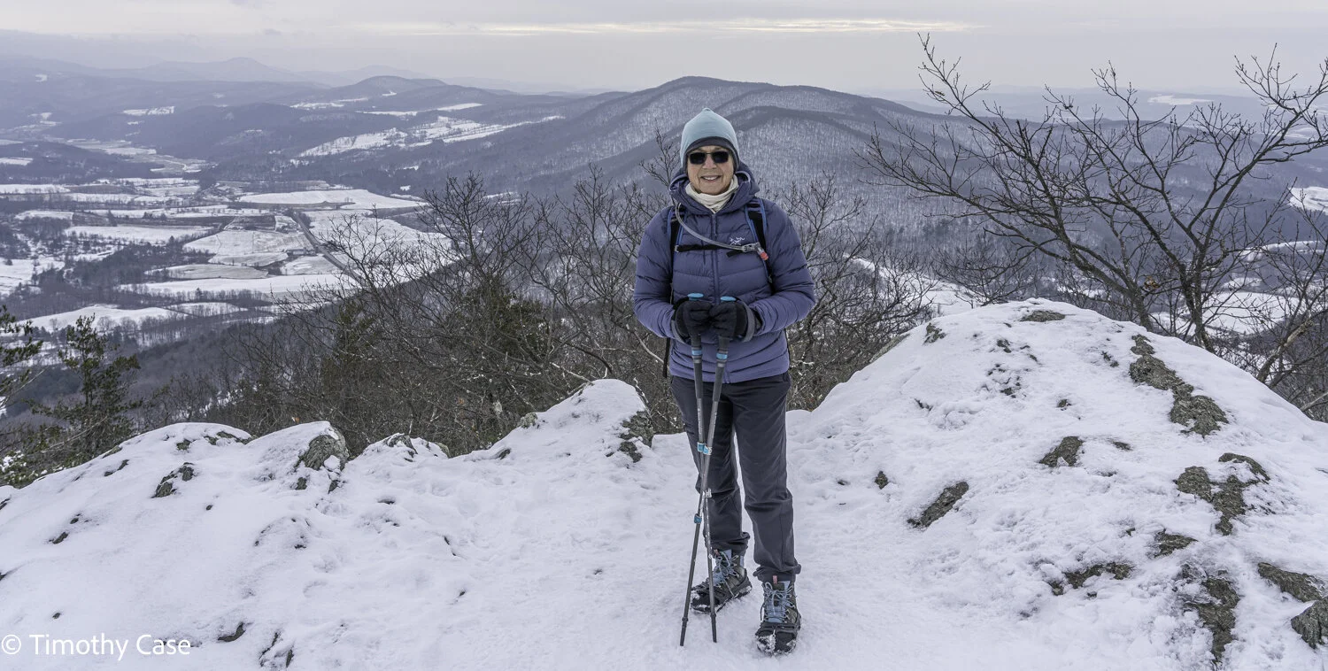 Barbara has a backpack with a 2.5 liter water bladder, and today she carried food, safety gear, and chemical hand warmers. Barbara almost always uses hiking poles; hers have an elastomer that provides wrist cushioning. 01-15-2021