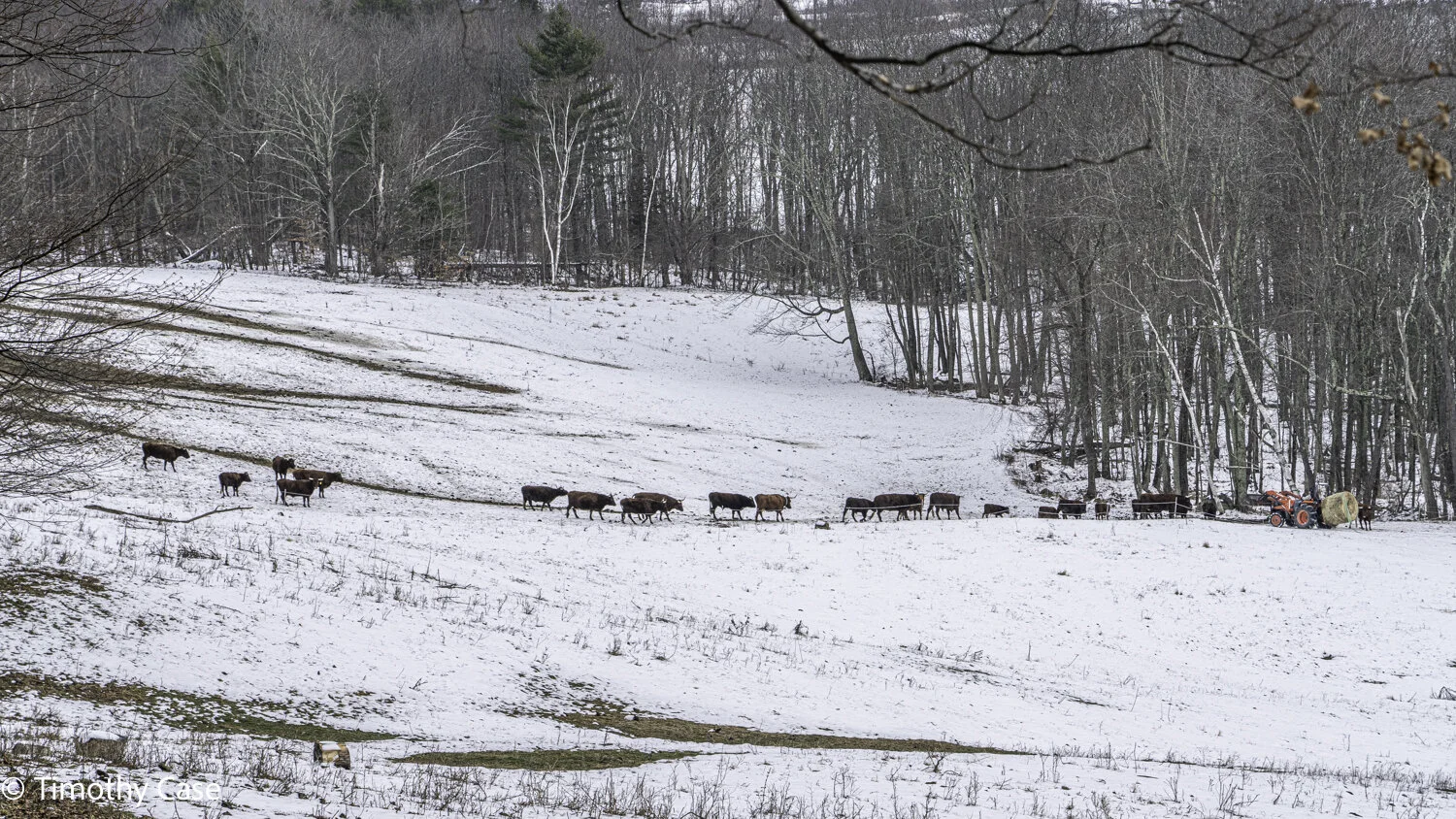 The valley echoed from the amazingly loud lowing of the large bull in a herd intent on reaching the ton bale being delivered by the farmer. 01-15-2021