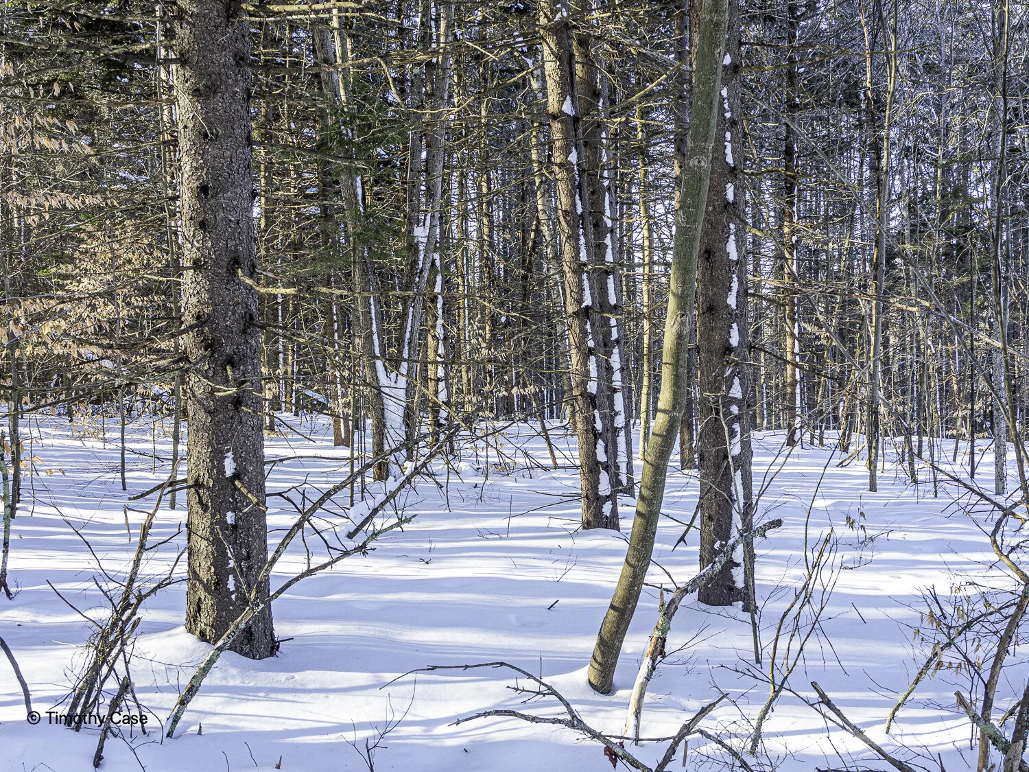 Route 67 is a two lane national forest dirt road that is closed to traffic in winter, at which time the road is available to hikers, snowshoers, cyclists, skiers, horses and snow machines (as they are called around here). This was our first visit here. The temperature was in the mid-20s and the skies were clear. Given the fabulous conditions, there were quite a few others enjoying the day, too, including some number of snowmobiles. I don’t mind them, but if you do, you’re better off coming on a workday.