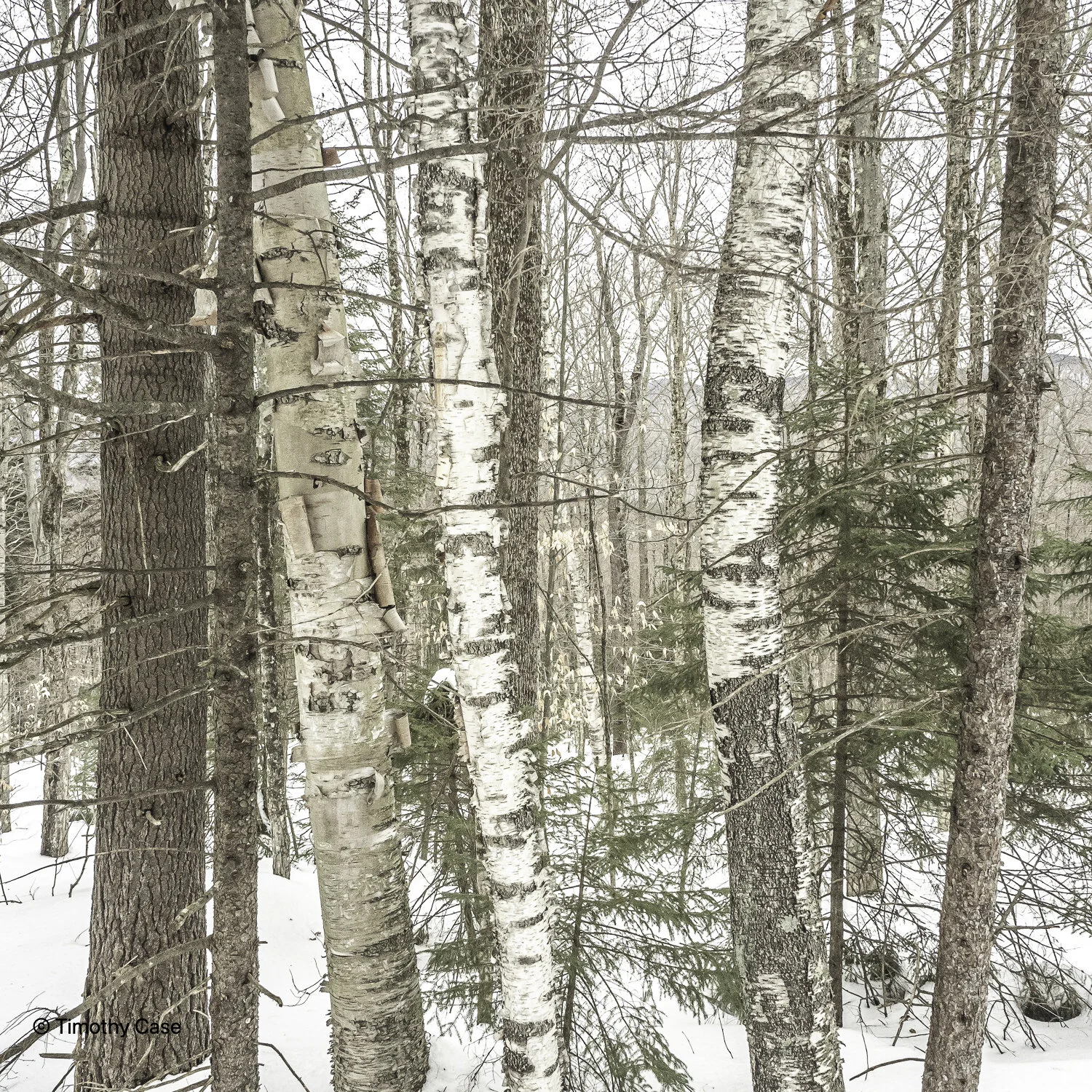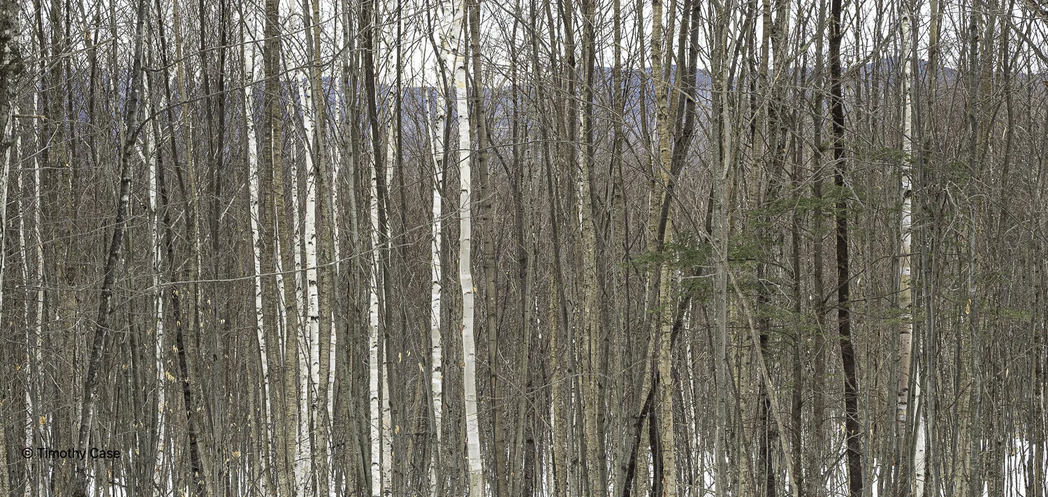 As near as I can make out from the photo, the trees in front with dark bark are Eastern Hemlock, while the 3 trees with light bark are, from the left, Yellow Birch, Paper Birch and Grey Birch. There are also a lot of Sugar Maple, the most common tree in Vermont, American Beech, White Pine, and White Ash in these forests, as well trees from the oak, pine, spruce families.