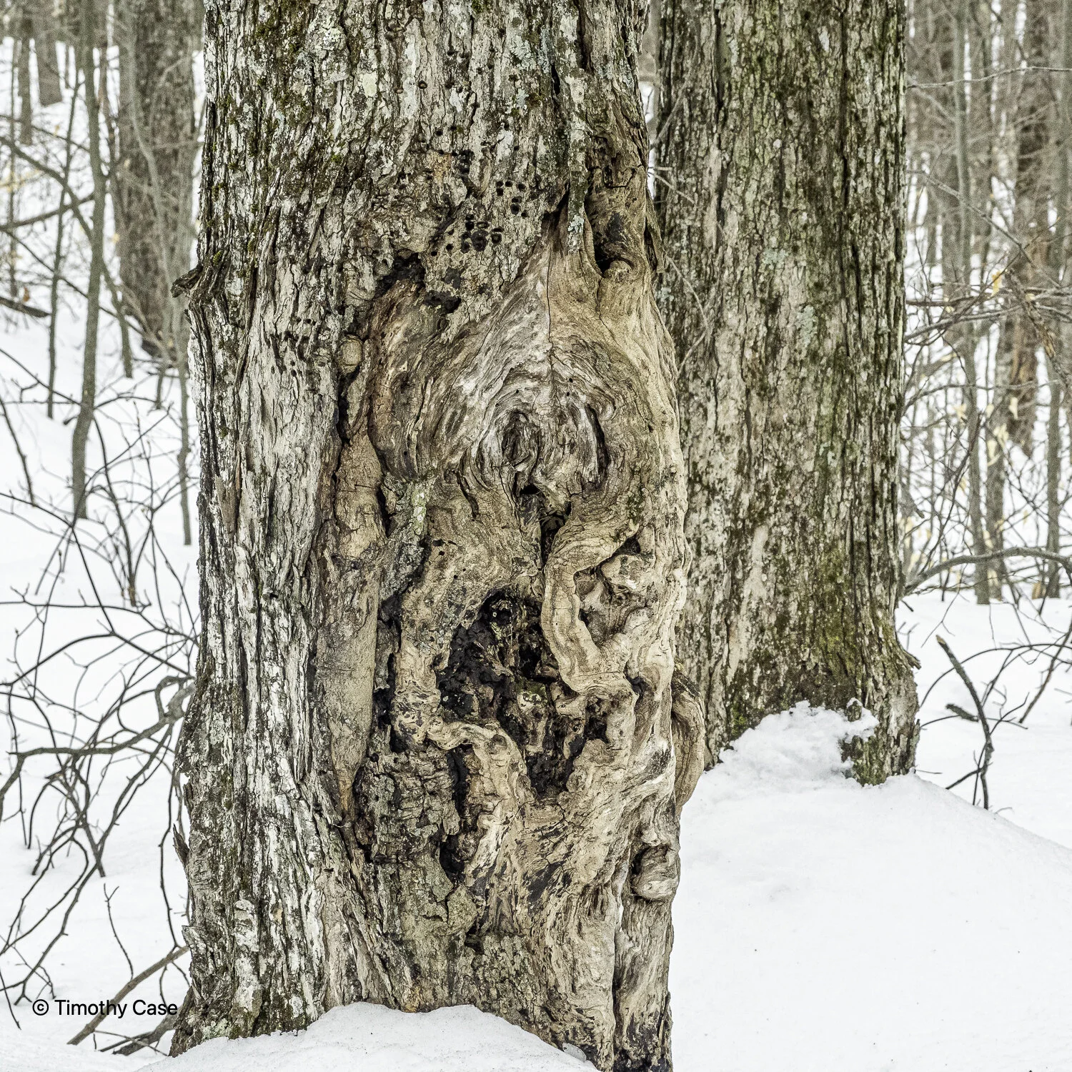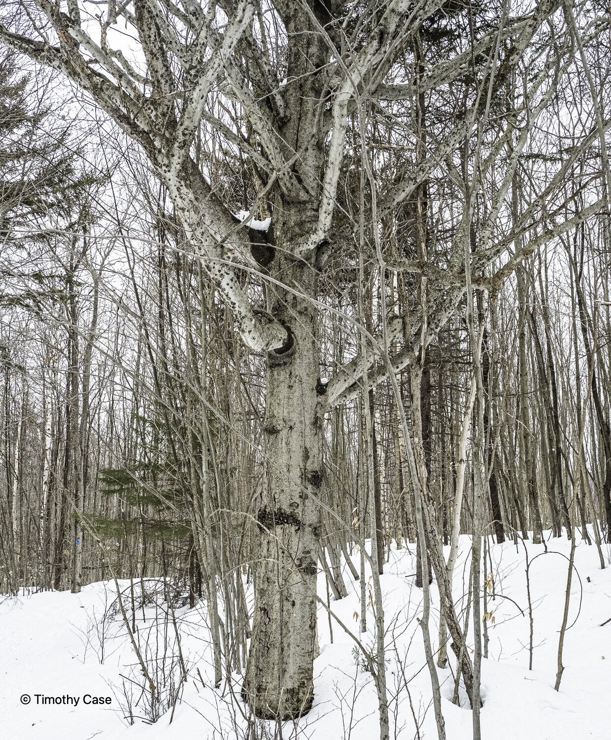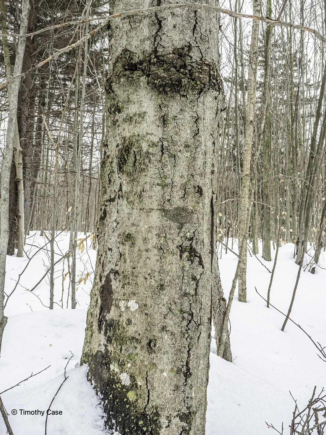 American Beech with beech bark disease caused by the beech scale insect, Cryptococcus fagisuga. A disconcertingly high number of the trees around here have the disease. The tree provides a lot of nutritious mast for wildlife and will impact the ecosystem as the beech die off.