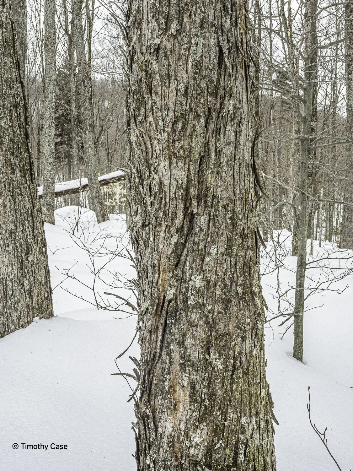 The hike on the Widows Clearing Trail in the Moosalamoo National Recreation Area begins to ascend right from the trailhead, While the snow off trail is around 18-24” on the trail was packed down and we didn’t need showshoes. While there is no old growth in this area, the forest progression remains interesting and engaging. We began in a Hemlock forest that transitioned to one dominated by birches. The remainder was the more typical mix of deciduous and coniferous. If you pay attention, you’ll see that the forest isn’t nearly as uniform as it appears from a distance and you’ll see that the 100-150 year old forests around are differentiated and are comprised of smaller individual natural areas with slightly different physical environments and mixes of trees. Proximity to water, availability of light and the soil and subsoil composition influence what trees thrive where within even the managed Green Mountain National Forest.